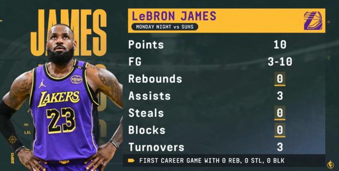 赛后,ESPN在复盘比赛时,晒出一组数据,詹姆斯在该场比赛中没有篮板、抢断和盖帽,这是他23年职业生涯中首次出现该情况。